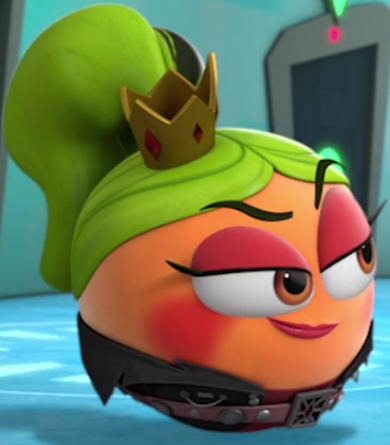 Aprilcot is a bright orange apricot with lime green hair and brown eyes. Her ponytail has black highlights. She sports a black leather jacket and belt, similar to a motorcycle gang member, and a gold crown with red diamonds. She is also one of the few characters without a visible nose.
