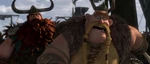 Gobber and Stoick surprised to see Hiccup and his classmates riding on dragons, realizing Hiccup was telling the truth.