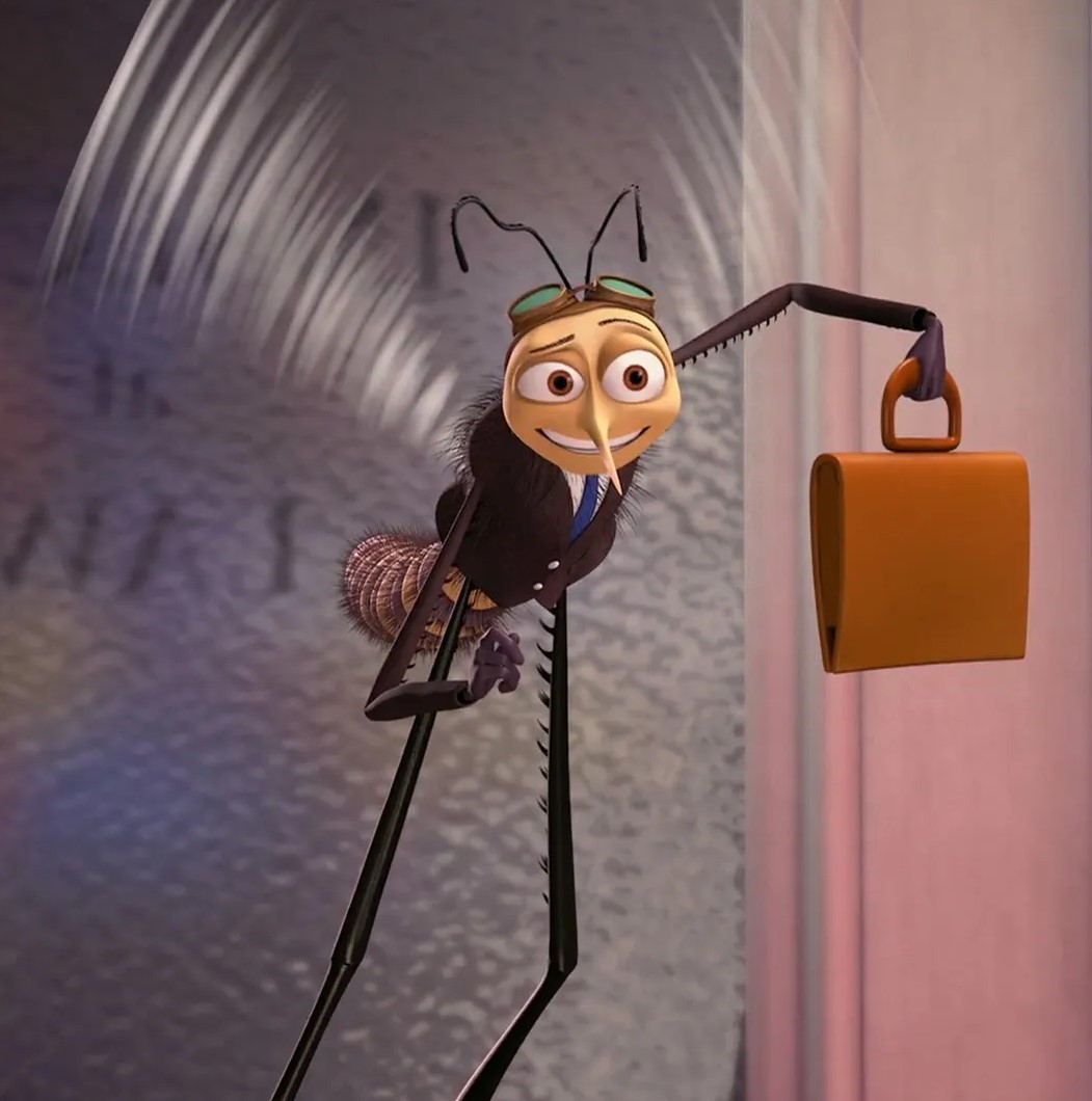 Mooseblood soon left for Alaska to experience the taste of moose blood and ended up colliding into the windshield of a Honey Farms truck along with many other bugs. Eventually, he met Barry Benson when the bee ended up on the windshield as well. Despite the arrival of wipers, they were able to find cover in the truck's horn. After the two had a conversation about their lifestyles and current predicaments, Mooseblood was drawn to a blood donation unit and met many other mosquitoes before asking if one of them had brought their "crazy straw".